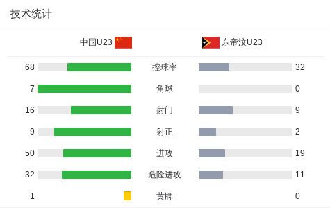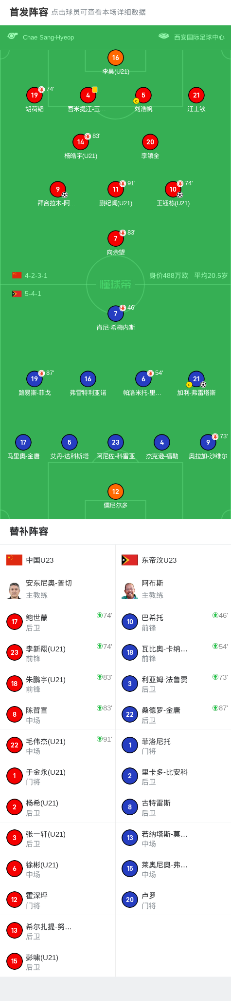 第41分钟,汪士钦定位球传中,拜合拉木后点推射得手,中国U23取得1-0领先