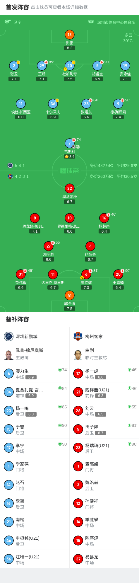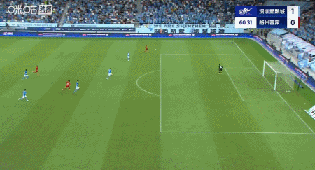第34分钟,姆贝克利送点,韦斯利点球命中,新鹏城1-0梅州