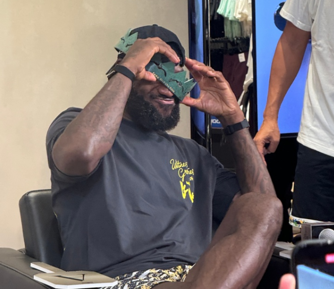 詹姆斯在登场后,果断扔掉雨伞,冒雨与一众球迷合影互动引发欢呼,并且做出比心与标志性的“戴王冠”动作。值得一提的是,有球迷给詹姆斯送上了自己制作的王冠作为礼物,詹姆斯也是尝试佩戴,但由于王冠太大,导致无法戴上卡在脸上极为有趣。