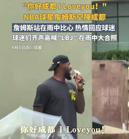 詹姆斯还对着成都的球迷高喊:“你好,成都!我爱你们!”全场球迷则是高喊“LBJ(詹姆斯英文名首字母缩写)”,詹姆斯与球迷的互动气氛极为热烈。