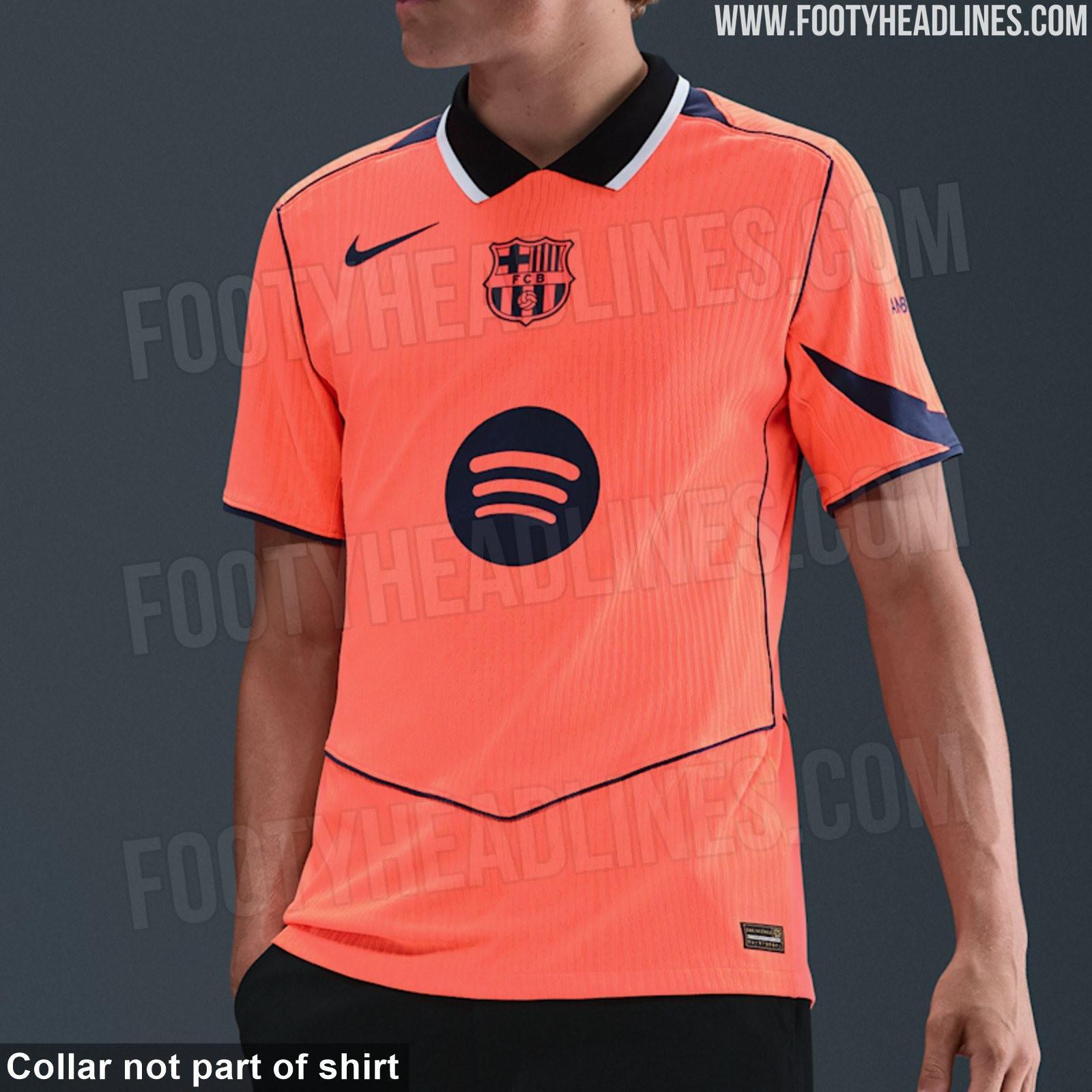 巴萨2025/26赛季第三球衣以明亮的橙色(官方命名为“亮芒果色”)为主色调,搭配深海军蓝(“午夜海军蓝”)作为配色,其颜色搭配与2009/11赛季的球队客场球衣十分相似。